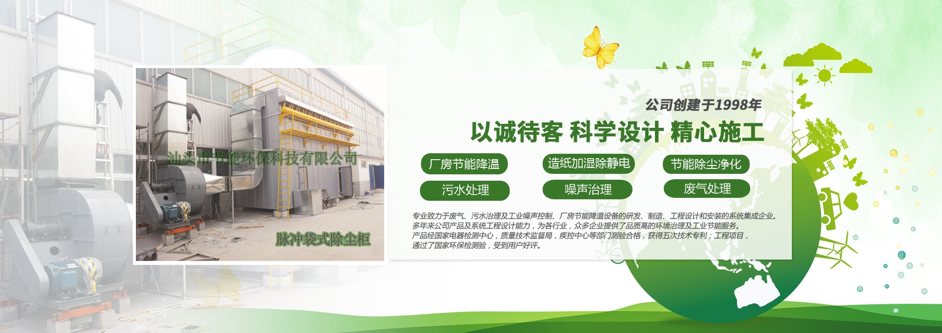 汕頭市節(jié)能環(huán)保科技有限公司創(chuàng)建于1998年,是一家專(zhuān)業(yè)致力于廢氣、污水、粉塵、噪聲治理,廠(chǎng)房節(jié)能降溫設(shè)備的研發(fā)、制造、工程設(shè)計(jì)和安裝的系統(tǒng)集成企業(yè)。多年來(lái)公司產(chǎn)品及系統(tǒng)工程設(shè)計(jì)能力,為各行業(yè),眾多企業(yè)提供了品質(zhì)高的環(huán)境治理及工業(yè)節(jié)能服務(wù)。產(chǎn)品經(jīng)國(guó)家電器檢測(cè)中心,質(zhì)量技術(shù)監(jiān)督局,疾控中心等部門(mén)測(cè)驗(yàn)合格,獲得五次技術(shù)專(zhuān)利;工程項(xiàng)目通過(guò)了國(guó)家環(huán)保檢驗(yàn)檢測(cè),受到用戶(hù)好評(píng)。